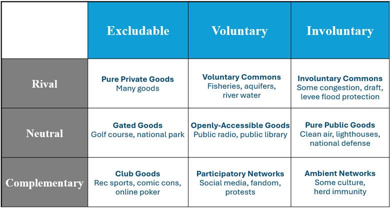 The same is true for Rivalry. A good can be “Non-Rival” because people’s uses do not affect each other, like two people’s separate use of a large national park. But it could also be “Non-Rival” in that other people’s use is a benefit to each user, like at a midnight showing of The Rocky Horror Picture Show, where other people’s shenanigans are the whole point of attendance. These examples show two different kinds of club goods: There’s the golf club model, where the club maintains a course that each member can enjoy separately, and there’s the game store model, where the store sells a coordination device for people who want opportunities to play with other people. The same distinction matters for Non-Excludable goods. Goods like clean air and public libraries can be consumed (involuntarily or voluntarily) regardless of the consumption of others. But social media, a defining good of our time, depends on the participation of other people.2 Much of culture has these dynamics—you can’t be prevented from participating and your returns are increasing in the participation of others. So, there are really three components to the Rivalry dimension: Rivalrous, Neutral, and Complementary.