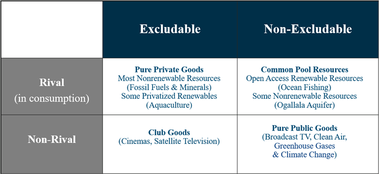 Economists often like to classify goods on a two-by-two grid: goods can be “Rival” or “Non-Rival” and they can be “Excludable” or “Non-Excludable.” Below is the grid we use in our introductory environmental economics course:
